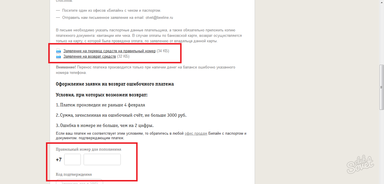 У оператора Билайн так же есть ряд условий для быстрого возврата средств: