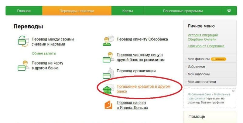 • Навержу найдите «Платежи и переводы», затем выбираем «Погашение кредита в другом банке»;