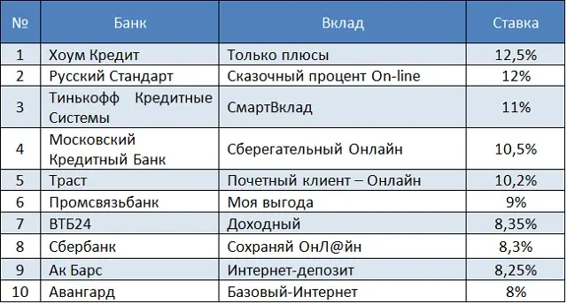 Лидером рейтинга вкладов, открываемых через интернет, стал депозит «Только плюсы» от банка Хоум Кредит. При оформлении заявки через сайт, на мобильный телефон клиента приходит смс-сообщение с кодом, который необходимо сообщить в офисе банка. За такую операцию обещан бонус, с которым доходность по вкладу достигает 12,5%.