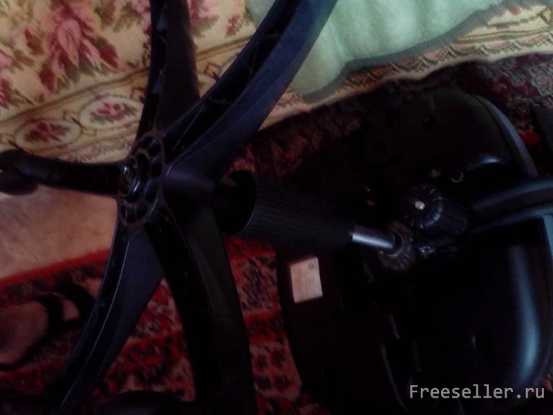 Далее надевается латунная шайба, затем подшипник, вторая латунная шайба. Удерживайте цилиндр в вертикальном положении и сверху наденьте черный «стакан» с крестовиной до упора так, чтобы конец штока вышел через отверстие в центре стакана. Поместите на прежнее место стальную шайбу и оденьте стопорное кольцо-клипсу. Далее, ставим крестовину на пол и надеваем сверху сиденье, совместив цилиндр и посадочное отверстие в механизме качания.24.04.2015