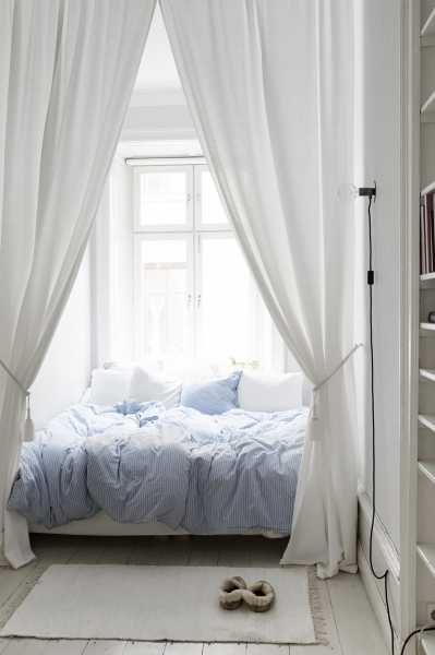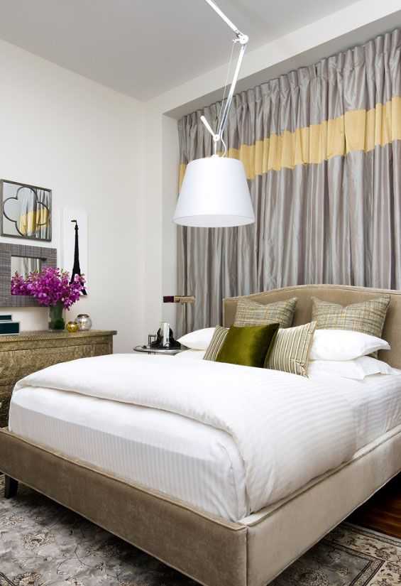 Самый простой выход — повесить плотные шторы, но из-за расположения кровати в ряде случаев придется пожертвовать их длиной, особенно, если изголовье стоит вплотную к оконному проему.
