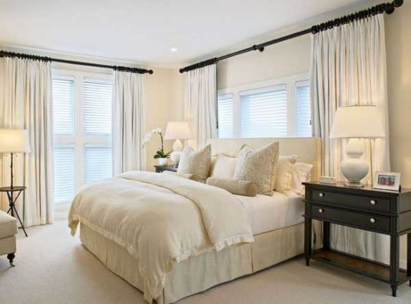 В спальне с двумя оконными проемами, расположенными на одной стене, кровать можно поставить в простенке, но если это детская, где нужно разместить два постельных места, то кровати изголовьем к окну будут более чем уместны.