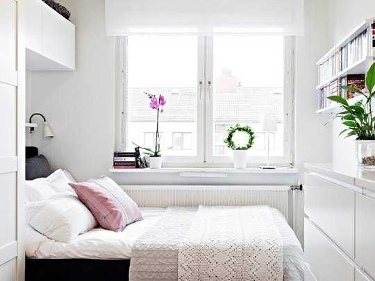 Установить кровать изголовьем к окну в небольшой спальне — эффективный способ экономии пространства. Так площадь помещения будет использована наиболее рационально, а у свободной стены можно поставить небольшой шкаф или зеркало со столиком и останется немного места, чтобы свободно передвигаться по комнате.