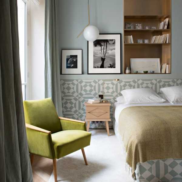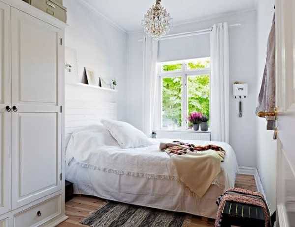 Если спальня не только маленькая, но и узкая, то один из вариантов — поставить кровать вдоль стены. Такое положение обычно оставляет свободный проход по комнате. В одном из своих проектов я выбрала именно этот вариант. Подходит для проходных и узких комнат.