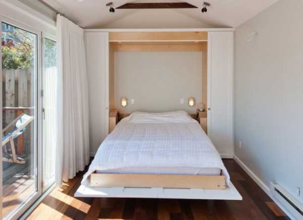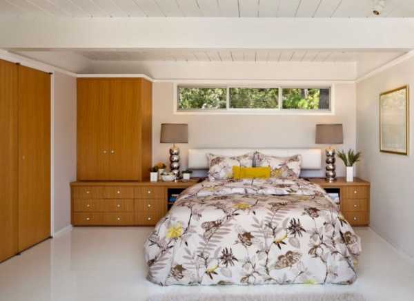 Довольно часто в спальне необходимо наличие мест для хранения вещей или постельного белья. С этой целью задействуют стену у изголовья спального места, что является наиболее рациональным вариантом в узких комнатах: