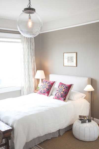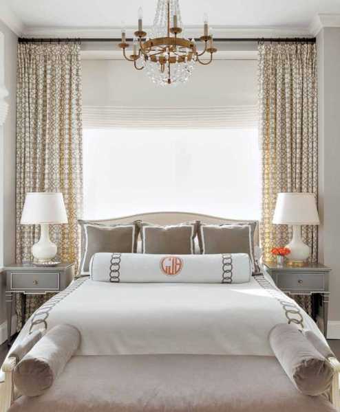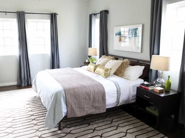 Размещение изголовья кровати вблизи небольших окон, разделенных с ней полоской стены, поможет и вовсе решить эту проблему