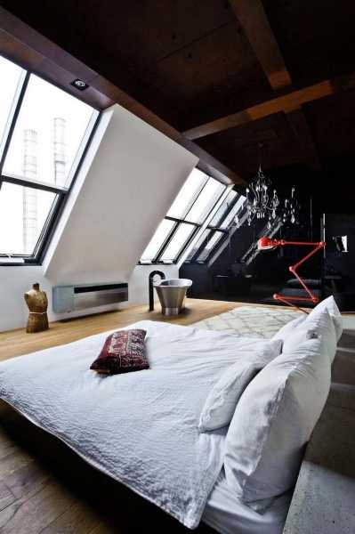 Нестандартное решение: расположение кровати «под окном» в мансарде позволит наслаждаться видом звездного неба