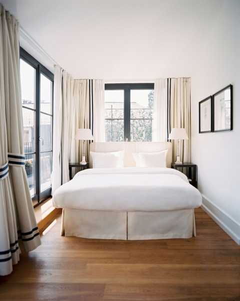 Эффектно выглядит дизайн просторной спальни в стиле минимализм. Белоснежные стены и залитая солнцем большая кровать создают ощущение свободы и комфорта. Изголовье не должно примыкать к окну полностью, чтобы воздушные занавески могли свободно струиться.