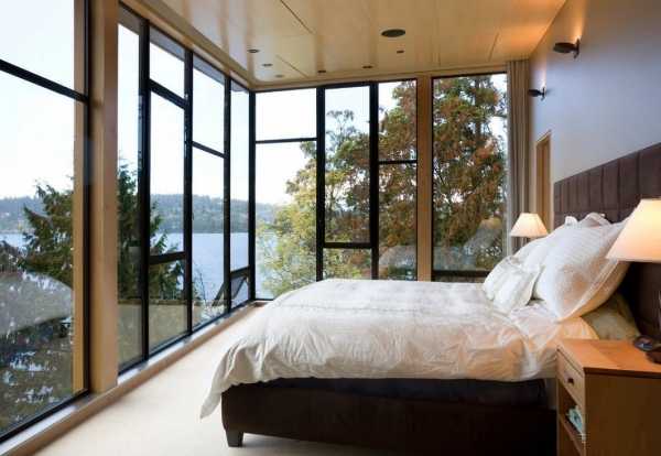 Угловая спальня в духе модерн с панорамным остеклением в загородном доме