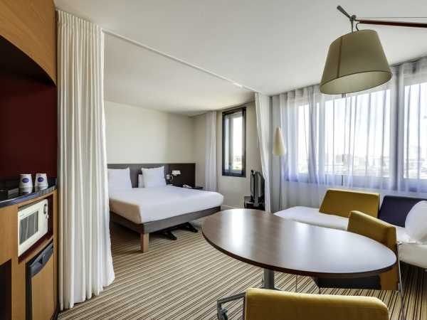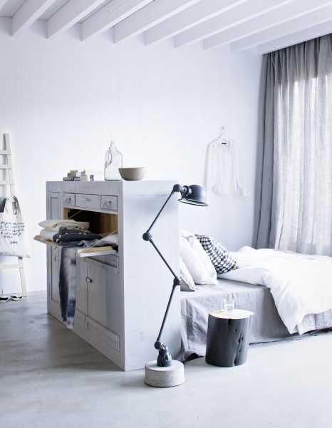 Эта планировка также визуально корректирует пропорции, если комната слишком вытянута. Спальное место получается практически в нише. Можно вместо каркаса кровати использовать различные подиумы.