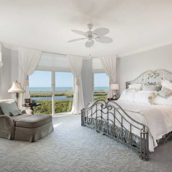 Интерьер угловой спальни с округленными стенами и множеством окон