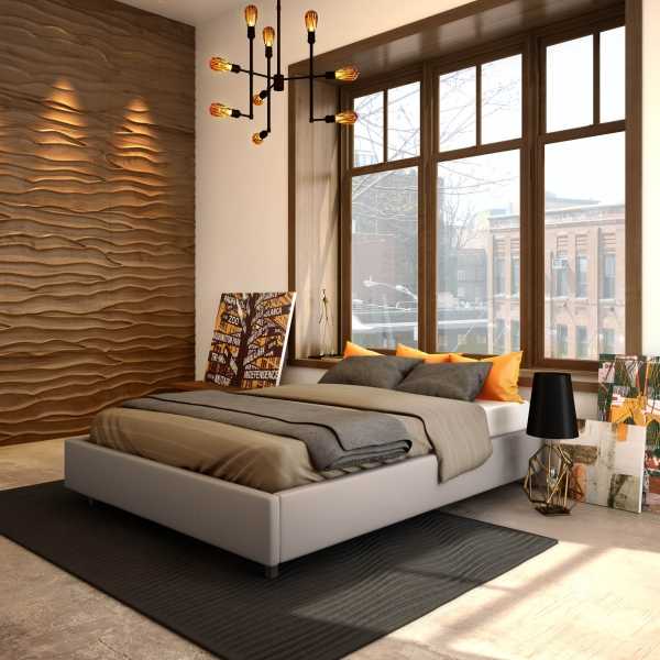 Важно! Такой ход позволит визуально приблизить короткие стены, а длинные отдалить. Благодаря этому спальня будет выглядеть более квадратной и просторной.