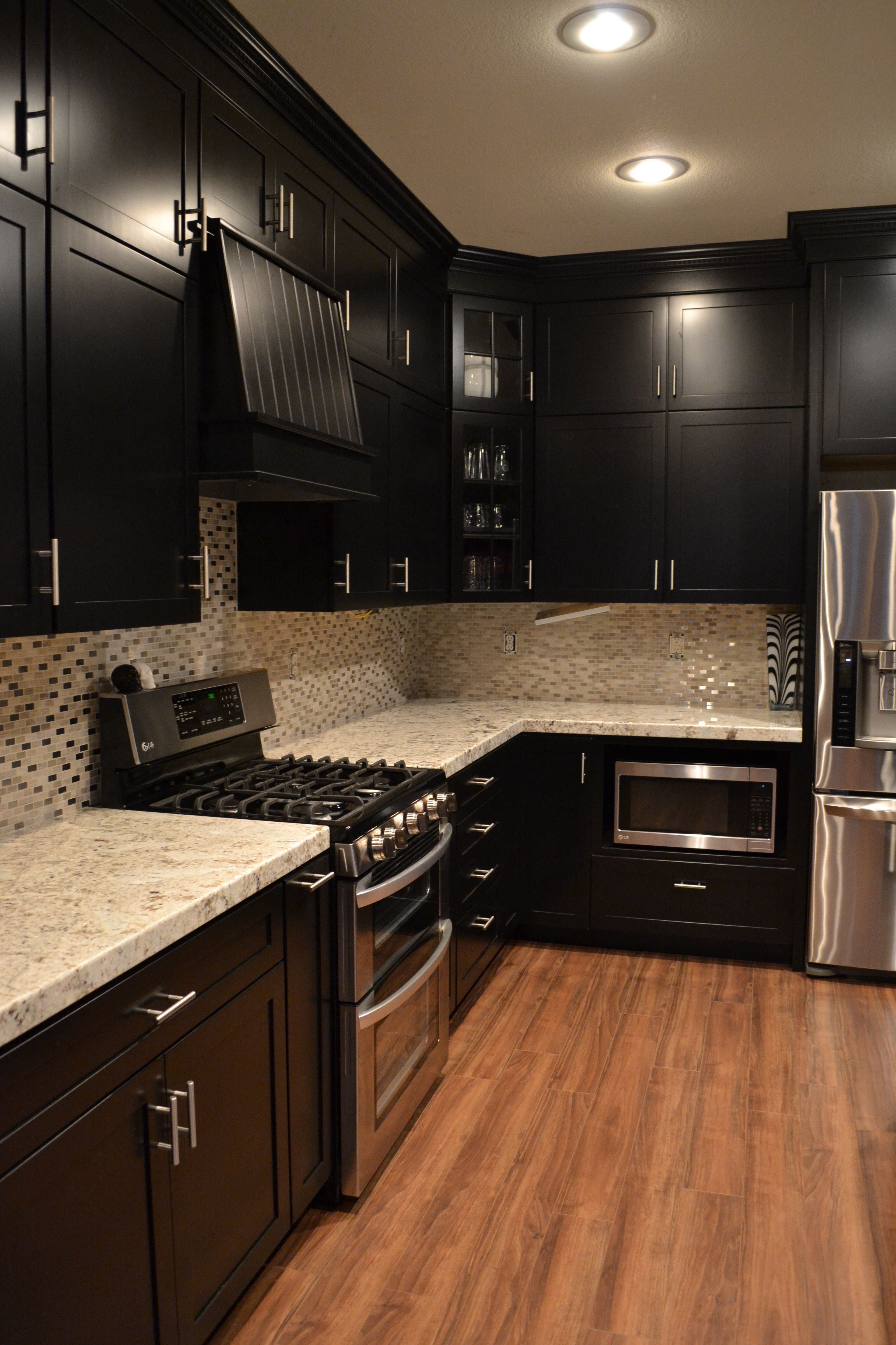 Как вы ясно заметили, черный — это цвет, который очень хорошо подходит для современных кухонь.Конечно, это не значит, что его нельзя использовать в сочетании с другими стилями. Эта деревенская кухня имеет черные шкафы вверху и внизу с красивой потертой отделкой, стеклянными дверцами и элегантной металлической фурнитурой. Напротив, столешница и фартук сделаны из дерева.