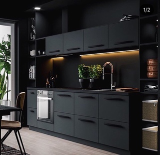 Черный как самый темный цвет не обязательно ограничен большими помещениями. Эта крошечная кухня выглядит шикарно и современно с черными шкафами с плоскими фасадами. {Найдено в creative}.