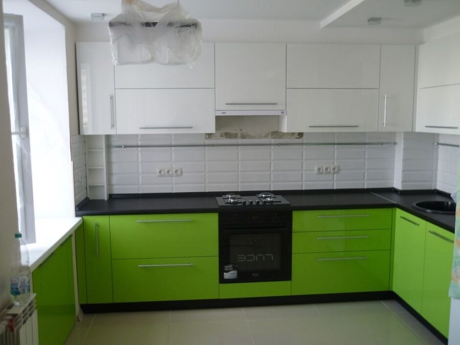 Настоящей свежестью и легкостью наполнит пространство кухонный гарнитур в зеленых тонах. Для фасадов можно выбрать однотонное изумрудное, салатовое, малахитовое и другое оформление. Также предпочитают двухцветную конструкцию с верхом зеленого цвета и с низом, выполненным в черном, коричневом, серебристом или белом цвете.