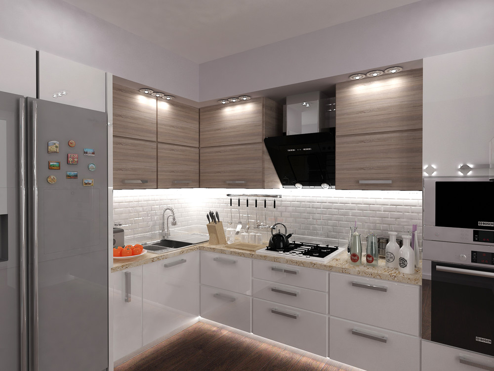 Не используйте более пяти оттенков: пол, стены, натяжные потолки, фасады, фартук могут быть оформлены в разных оттенках. Верх обычно более светлый, низ – темный. Исключение составляют кухни в особо просторных помещениях.