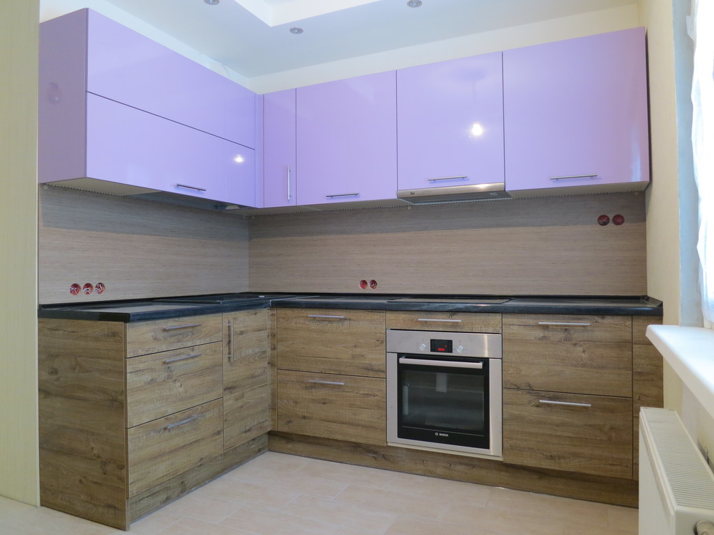 На фото — кухня в сочетании сиреневого и фисташкового цвета.