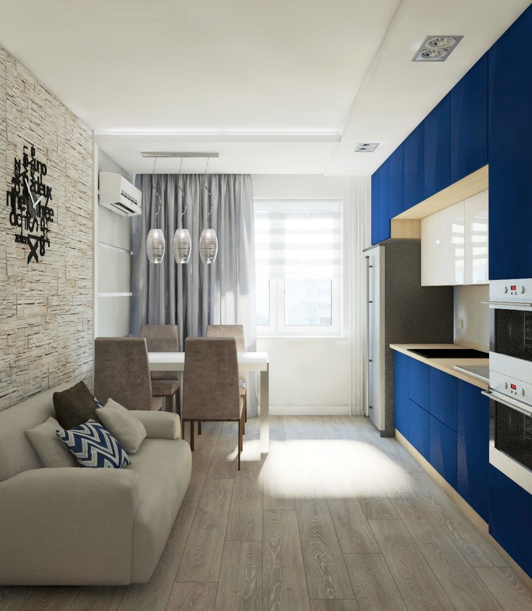 Это практичный вариант, который подходит для всех комнат без исключения. Конечно, ее чаще используют в достаточно узких помещениях. Вдоль самой длиной стены располагается фурнитура, отлично, если со встроенной техникой. На противоположной стороне находится обеденная зона. Чтобы заполнить одинокую стену, можно повесить картину, телевизор или еще какой-то декор на ваше усмотрение.