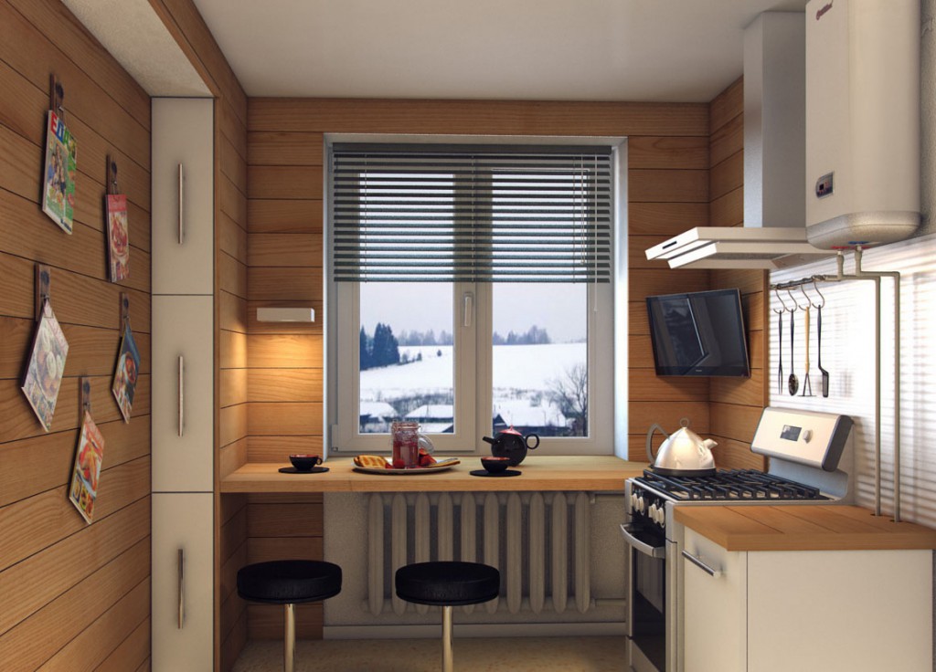 Здесь вполне можно разместить небольшой холодильник, многофункциональный кухонный гарнитур с выдвигающимися ящиками, компактные мойку и плитку, и даже откидному столику место найдется.