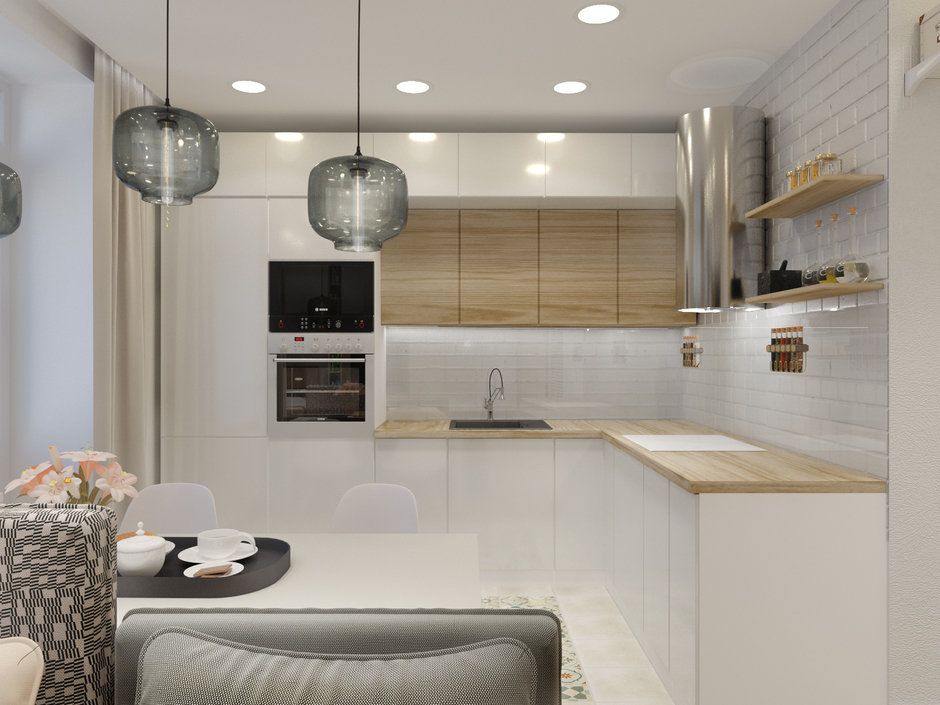 Рабочая зона выстраивается вдоль одной стены, а обеденный стол в зависимости от конфигурации ставят либо в торце, либо к стене напротив кухонного гарнитура. Угловая планировка универсальна, но подойдёт для квадратной комнаты.