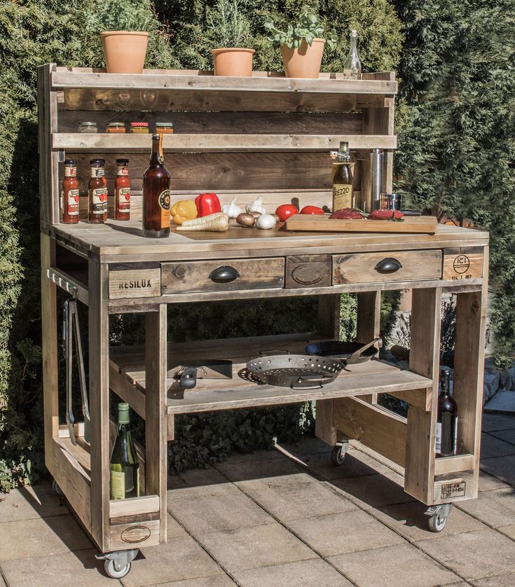 Еще один способ с умом использовать ненужные строительные палеты – превратить их в летнюю кухню. Самый простой вариант – сделать ее в форме стола либо ящика с отверстием для мойки.