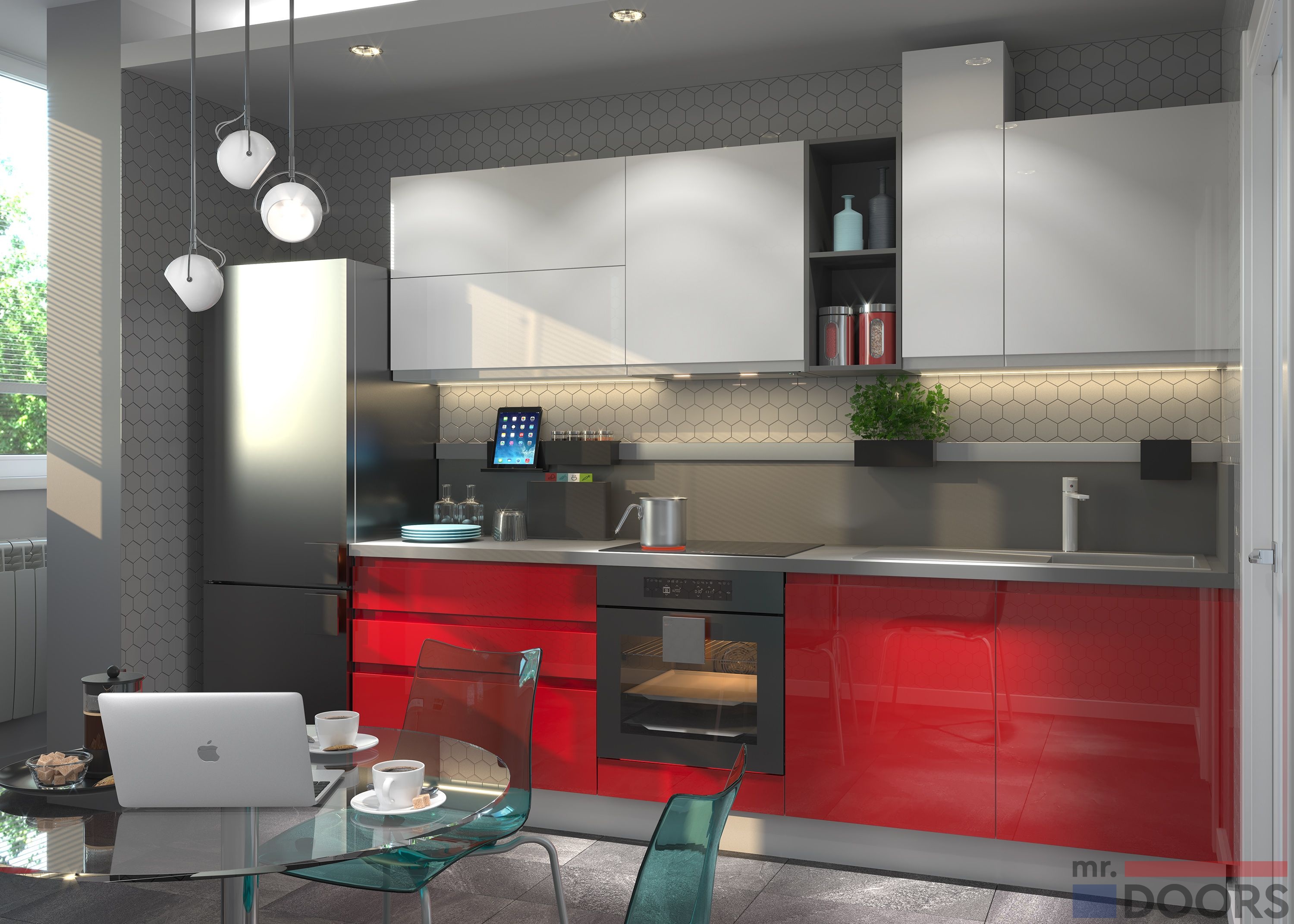 Он уравновесит и смягчит красный в интерьере, добавит на кухню света и простора. Желательно что бы белый преобладал в интерьере.