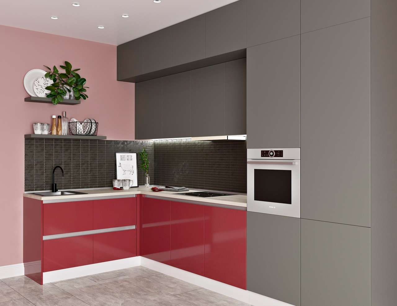Красно-серый кухонный декор создает спокойную атмосферу. Кухня из граната, малины или вишни гармонично сочетается со стальной техникой, сланцевыми столешницами и серыми стенами.