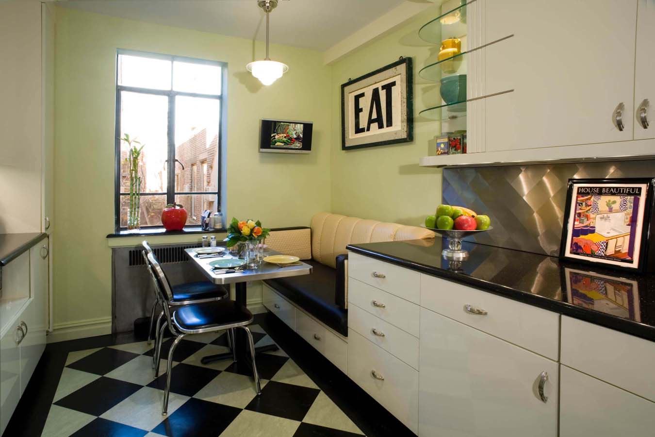 Если диван — это не просто зона отдыха, а дополнительная кровать в доме, постарайтесь изолировать его от обеденного стола. Но в то же время, если в доме гости, так легко уложить на диван. На кухне есть телевизор, логично, что перед ним будет диван. Это означает, что ваш телевизор находится не на месте стены в жилой зоне.Таким образом, диван следует размещать перпендикулярно рабочей зоне.