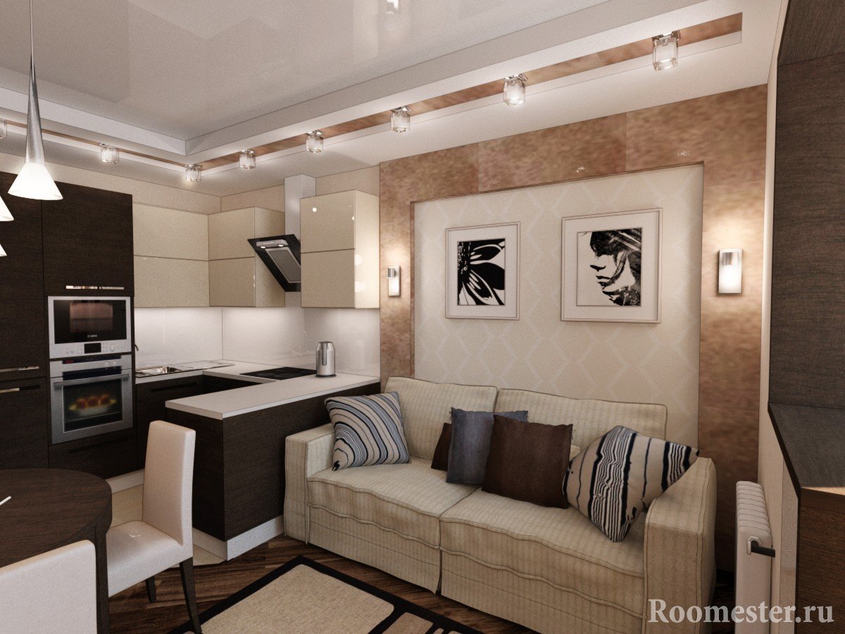 Нередко хозяева решаются на совмещение пространства, ведь размер кухни позволяет организовать в ней еще и небольшую гостиную. В случае если квартира однокомнатная, решение вполне разумное.