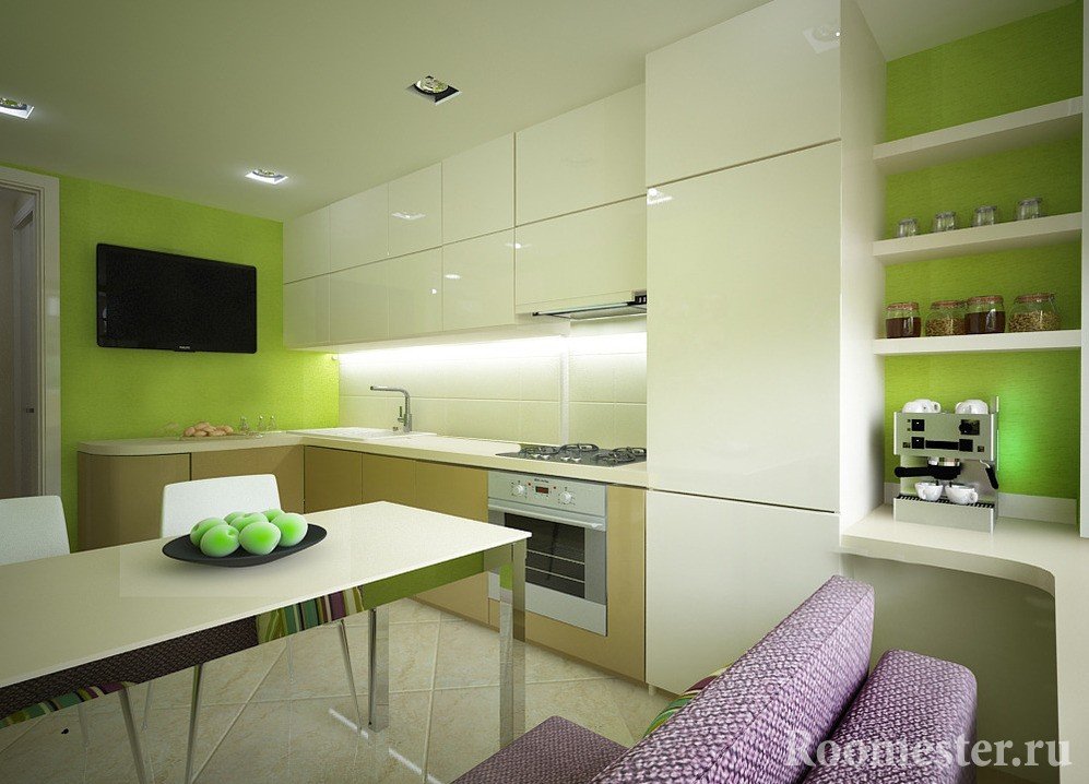 Но еще проще оборудовать кухню диваном и телевизором, применив четкое зонирование. Этот вариант больше подходит прямоугольной кухне. Помещение разделено на 2 части: одна — рабочий сектор зоны приготовления пищи, другая — зона отдыха. Кого из них будет больше, решать вам. А вот от идеи мини-гостиной сложно отказаться, потому что она удобна — диван и стол перед телевизором, а также отделение от кухонного гарнитура не отвлекает.
