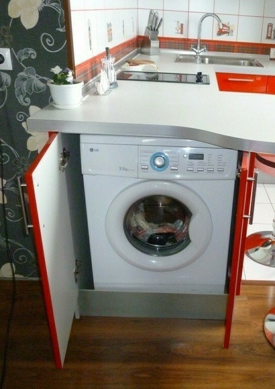 К положительным сторонам установки на кухне бытового прибора, призванного отстирывать одежду, относят: