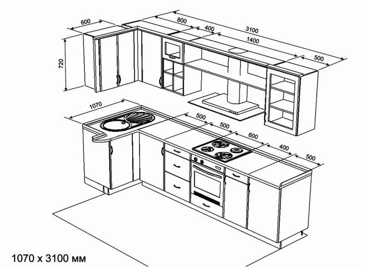Вам нужно будет сделать план (то есть вид сверху) для всей кухни и чертеж вида спереди каждого набора шкафов, включая верхние шкафы.