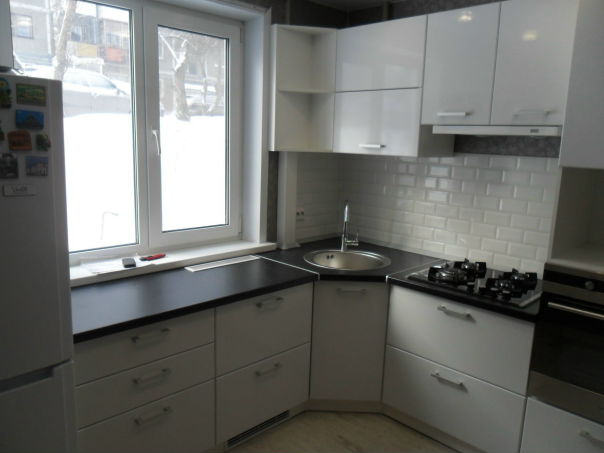 Угловой кухонный гарнитур с мойкой у окна
