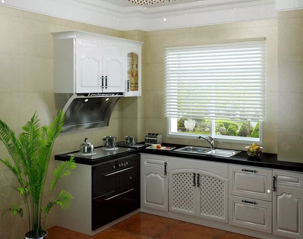 Что касается декоративного оформления окна, то лучше ограничиться лаконичными жалюзи, римскими шторами или ролетами. Не стоит использовать классические занавески или тем более шторы. Важно что-бы материал из которого сделаны шторы было легко стирать или вытирать, особенно если у окна вы планируете расположить плиту.