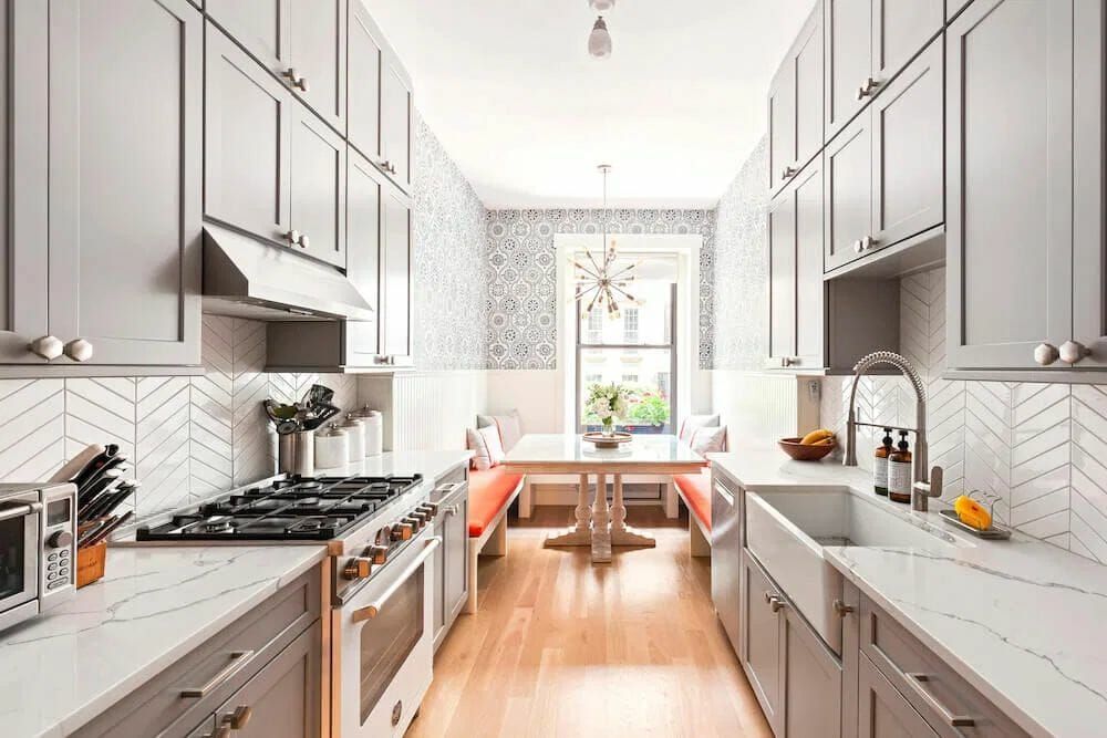 Длинная узкая комната — это не приговор, а дополнительные возможности, которые откроет правильное зонирование. Здесь дизайнер работал с настоящим «вагоном», ограниченным по ширине. Внушительная длина позволила найти место не только для зоны готовки, отдыха и столовой группы, но и для полноценного рабочего места.