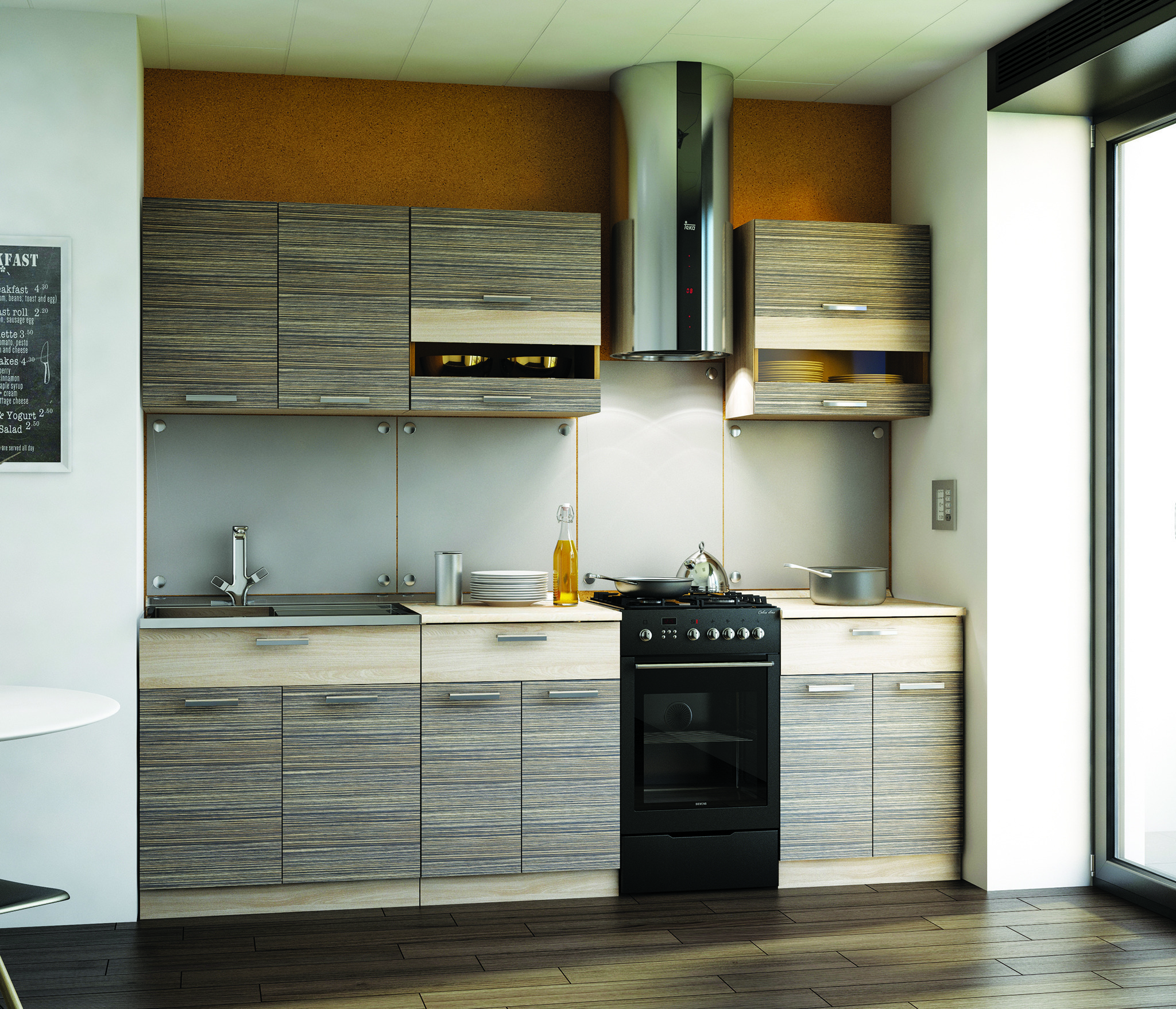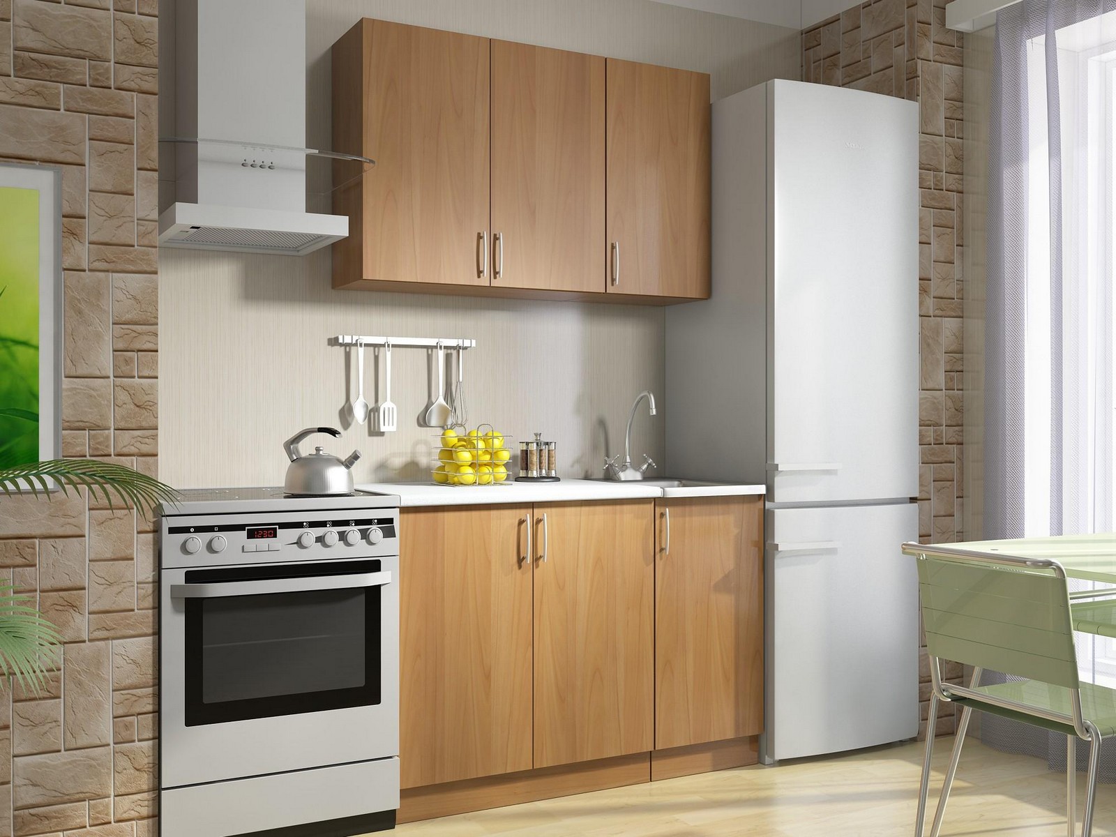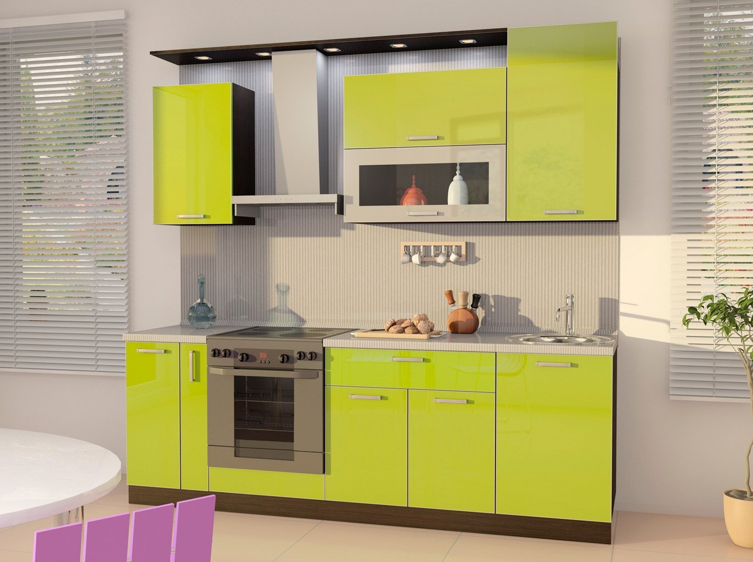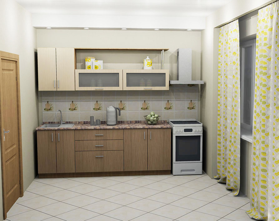 Для маленькой кухни прекрасно подойдёт линейная модель кухонного гарнитура: в таком проекте шкафы с холодильником размещаются в одну линию вдоль стены. В длину гарнитур может варьироваться.