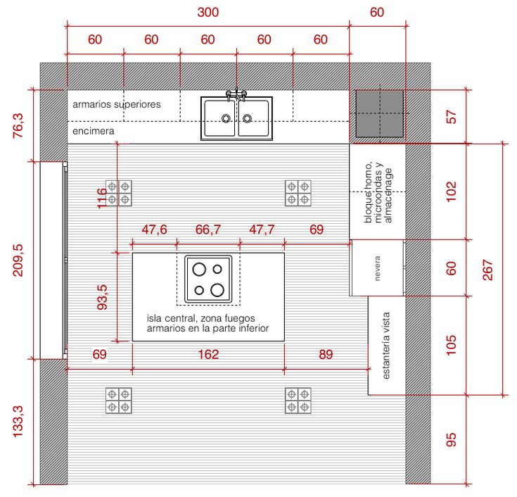 Стандартный кухонный остров имеет размеры 40 на 80 дюймов (100–200 см) и высоту 36–42 дюйма (90–100 см).