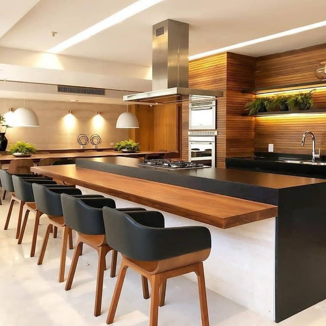 Здесь дизайнер использовал монохроматическую палитру, чтобы легко связать кухню с остальной частью дома. Отделка из темного дерева выглядит шикарно и уютно, а вся кухонная техника гармонично сочетается с деревянной мебелью. Подвесные светильники и более светлый пол немного контрастируют с концепцией и улучшают общую эстетику помещения. Стильная барная стойка придает кухне современный вид.
