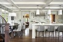 Ланкастер, SCСмешивание отделки, текстуры и стилей кабинета — простой, но эффектный способ добавить к пространству переходного ощущения. Цвет негабаритных осветительных приборов красиво дополняет островную мебель.
