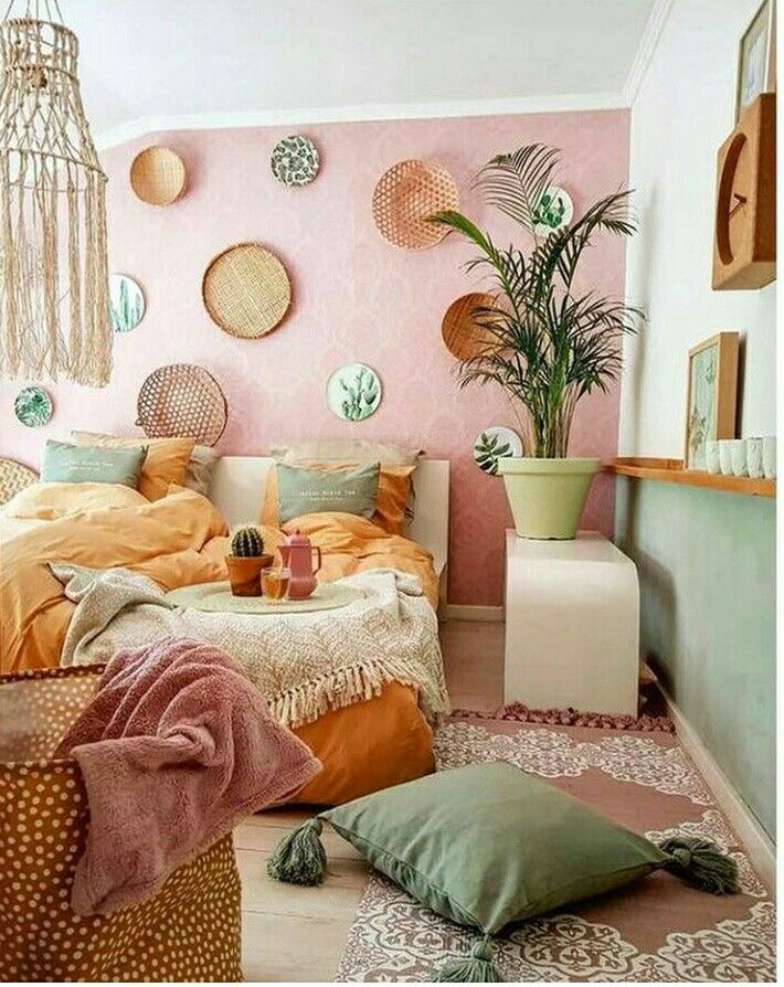 Интересный тандем можно получить при комбинировании бежевого с контрастными теплыми оттенками. Для стиля бохо в качестве дополнительного цветового акцента хорошо подходят спокойные оттенки. Например: