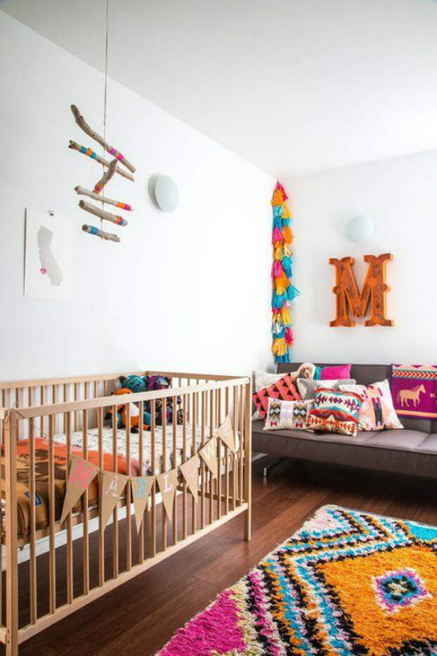 • Обязателен ковер с этническим узором. Ковер и сам по себе – важная и уместная деталь для детской, а буйство красок на полу только подстегнет фантазию маленького хозяина.