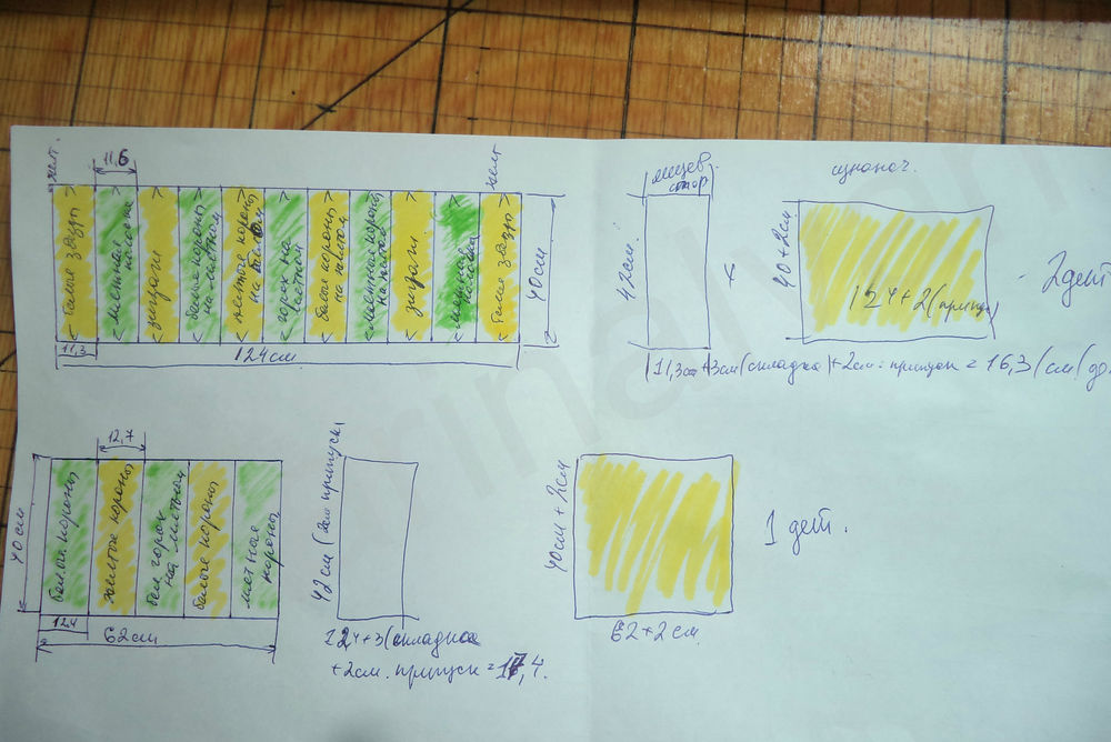 Размер одного модуля — 30*30 см, или близко к этому, потому что предназначены бортики для стандартной кроватки — с основанием 60*120 см. А так как нужны они только в одной части, то как раз укладываемся в 6 модулей. Начертила схему, уже сделав в ней разбивку на лоскутки, так, как мне это видится