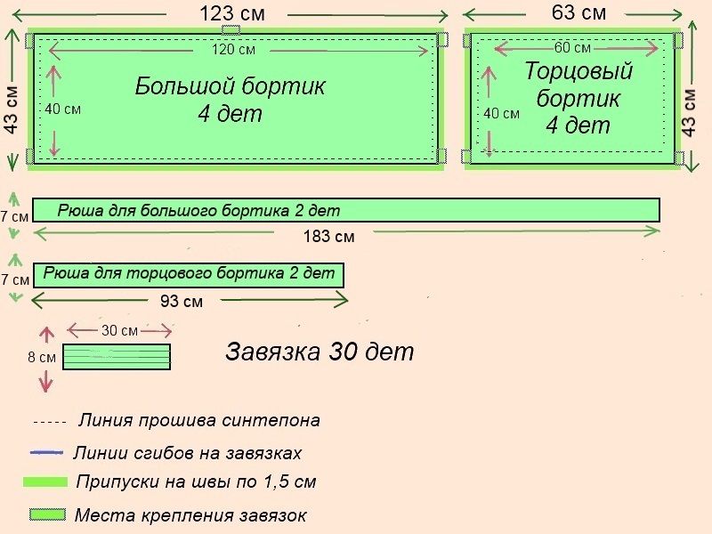 Примечание: Если шьются бортики-подушки, то нужно делать минимум по два крепежных элемента на каждую.