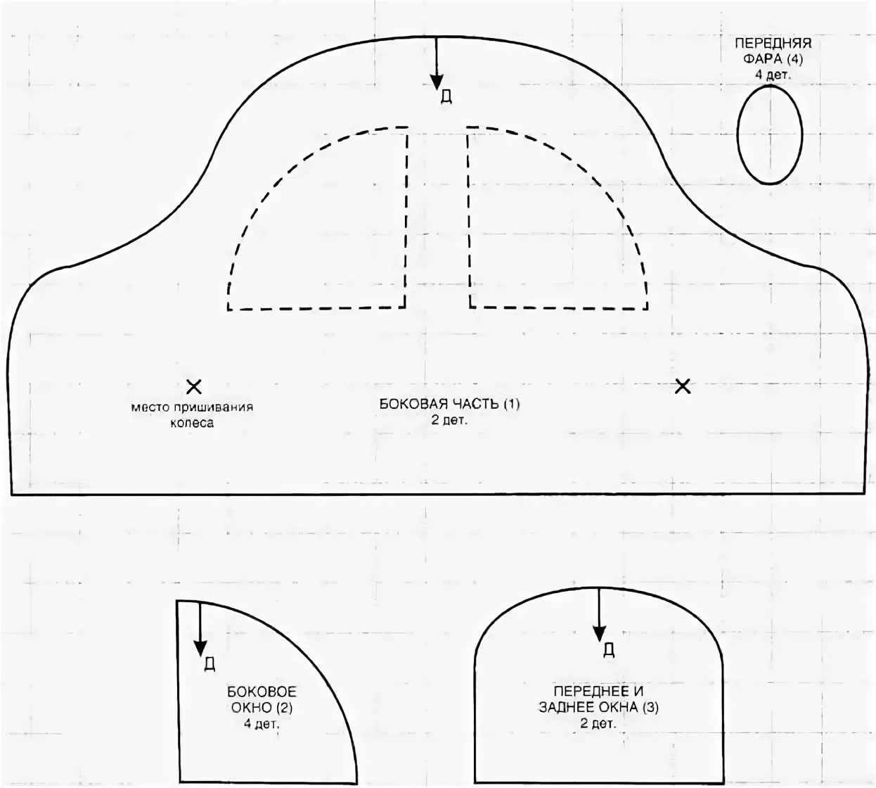 Для стандартных классических бортиков из 4-х элементов подойдут следующие выкройки: