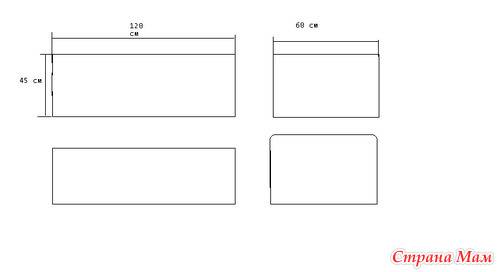 Наполнитель в виде рулонного синтепона или поролона раскраивается аналогично, но нужно размеры выкроек уменьшить на 1,5-2 см в зависимости от толщины поролона, чтобы наполнитель влез в чехол. Если бортики шьются в виде подушек, то наполнитель набивается просто так, ничего раскраивать не нужно.