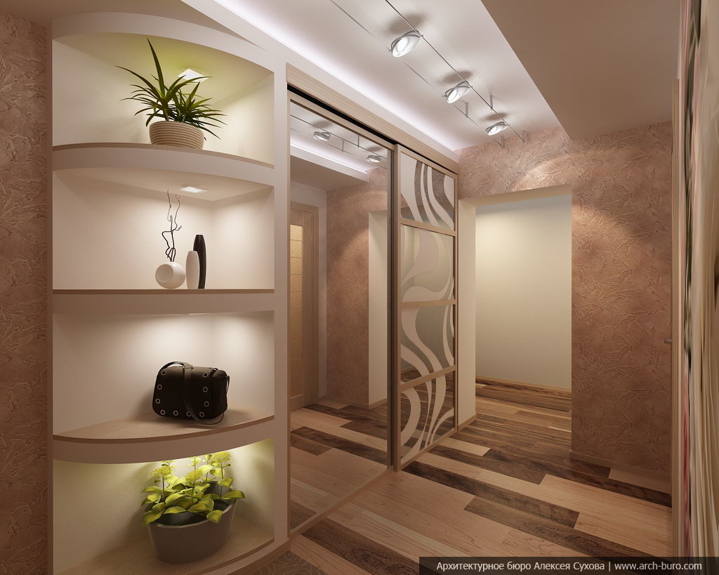 Коридор — это обычно плохо освещенная комната из-за отсутствия окон.Важно позаботиться о наличии качественных осветительных приборов, как на фото. Кроме того, в комнате могут быть различные ниши или выступы, где при желании можно установить небольшой комод для хранения различных предметов гардероба, книжную полку, пуфик, красивую картину или прикроватную тумбочку с телефоном. Такая обстановка способна освежить дизайн коридора в квартире, придав ему совершенно новый вид.