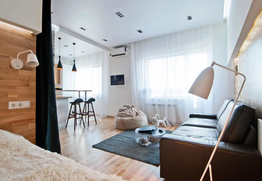 На фото квартира-студия 40 кв., с гостиной и спальной зоной, разделенными при помощи штор.