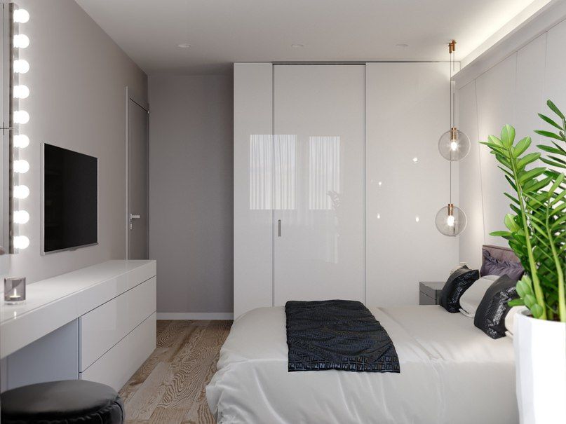 Обратите внимание на вариант, где между спальней и входом установлена перегородка, на которой висит телевизор.
