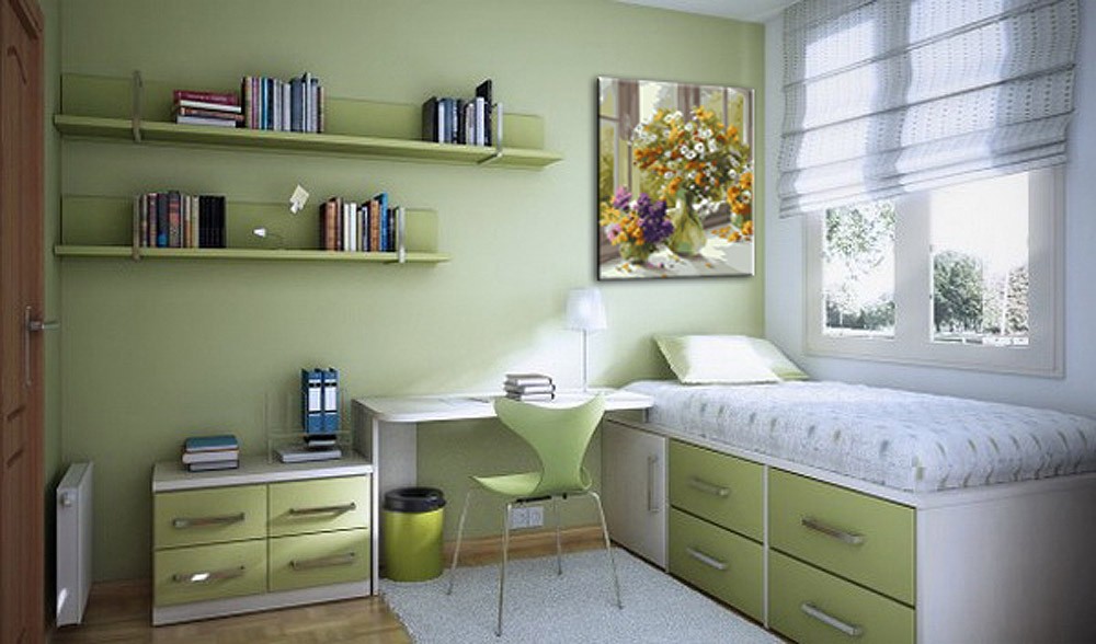 Справа от него у другой стены ближе к углу расположится шкаф. Слева от рабочего места разместится кровать. А слева от двери ближе к углу стоит установить стеллаж для хранения различных вещей.