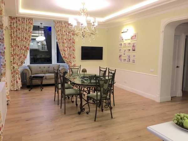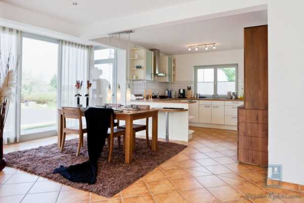 Важным моментом является выбор материалов для обустройства кухни-гостиной. Они должны быть прочными, современными, долговечными и легкими. Для визуального разделения рабочей зоны от гостиной можно использовать установленную на полу в кухне керамическую плитку, положив в присоединенной гостиной ламинат.